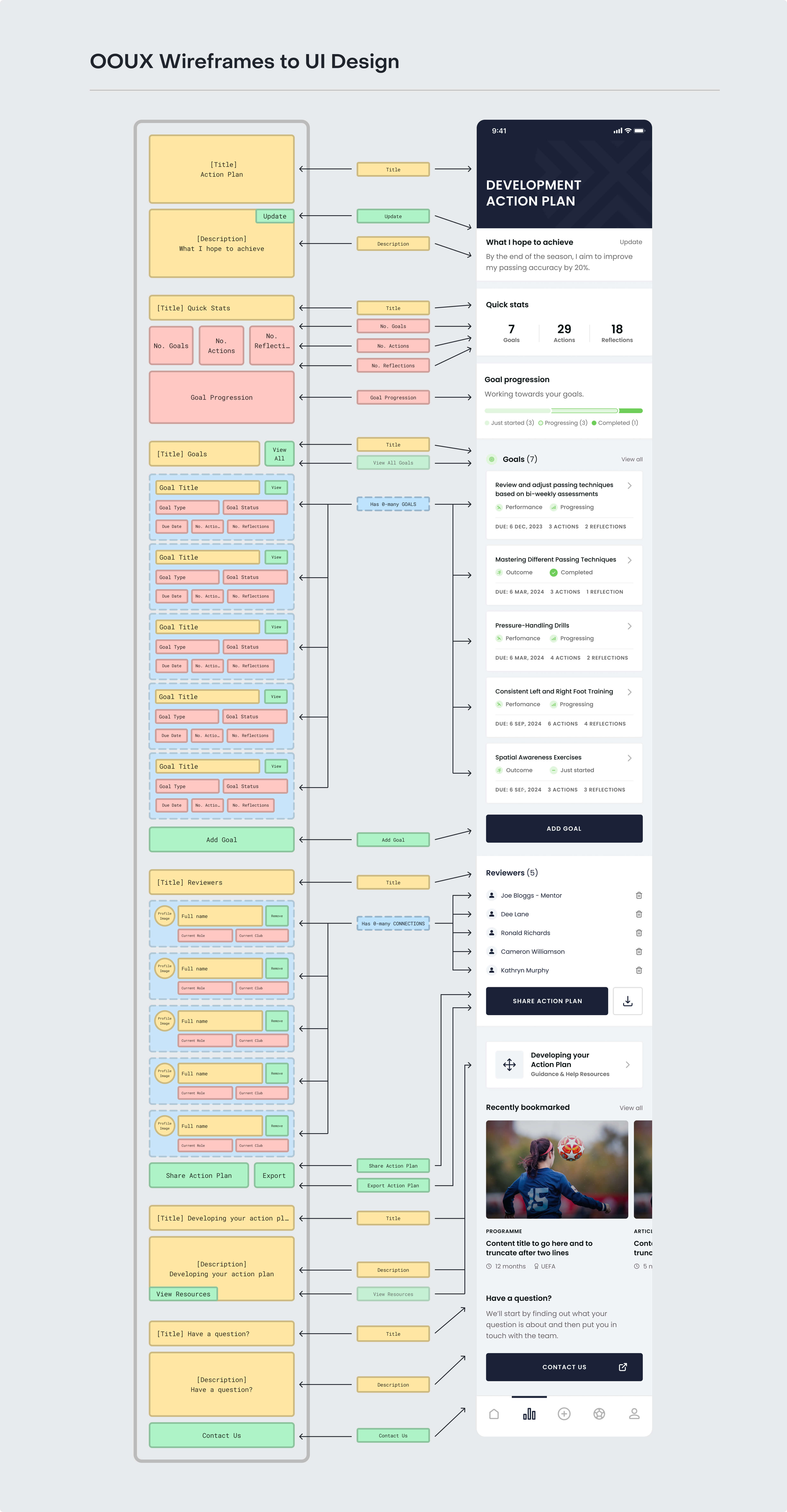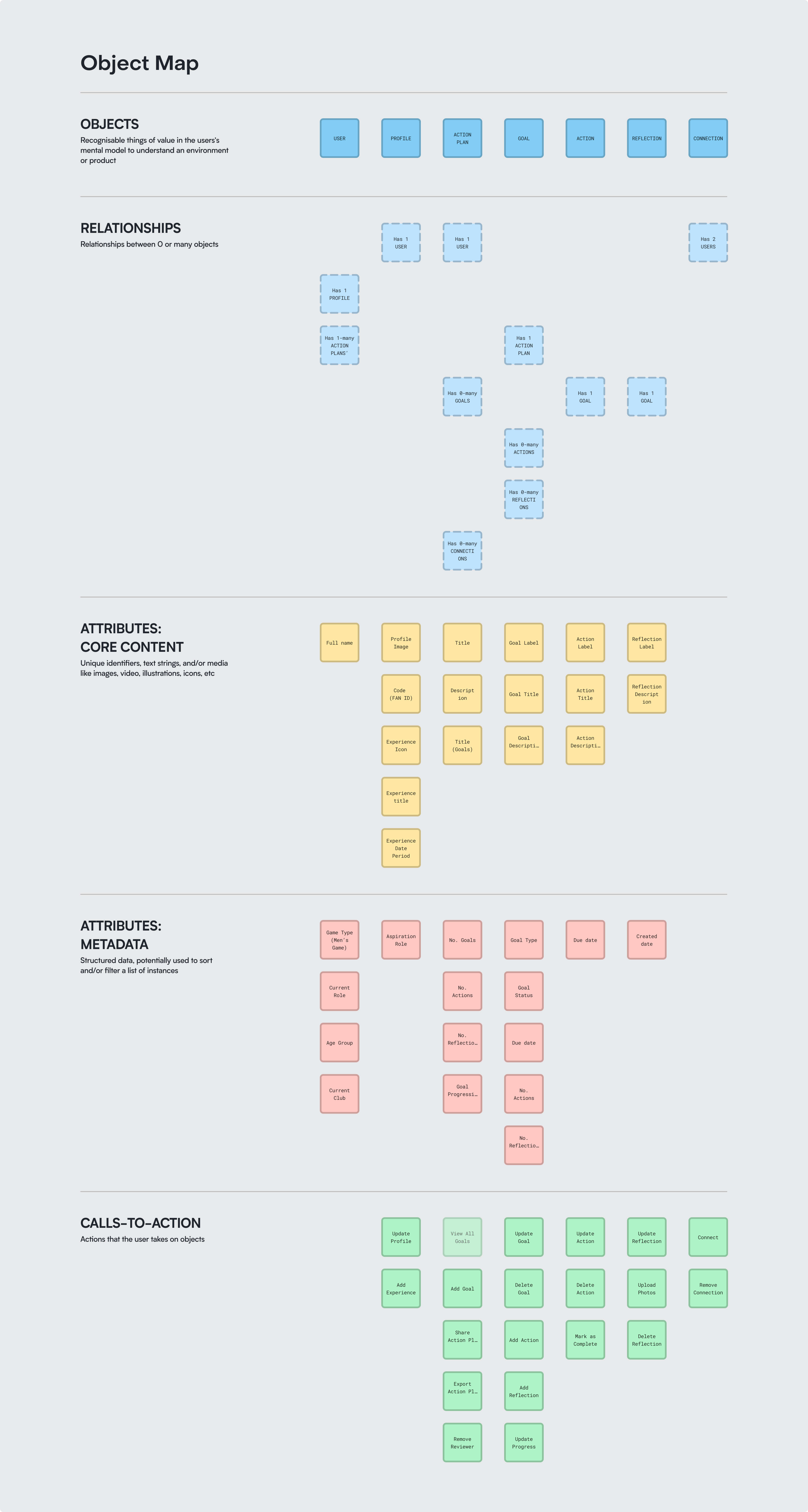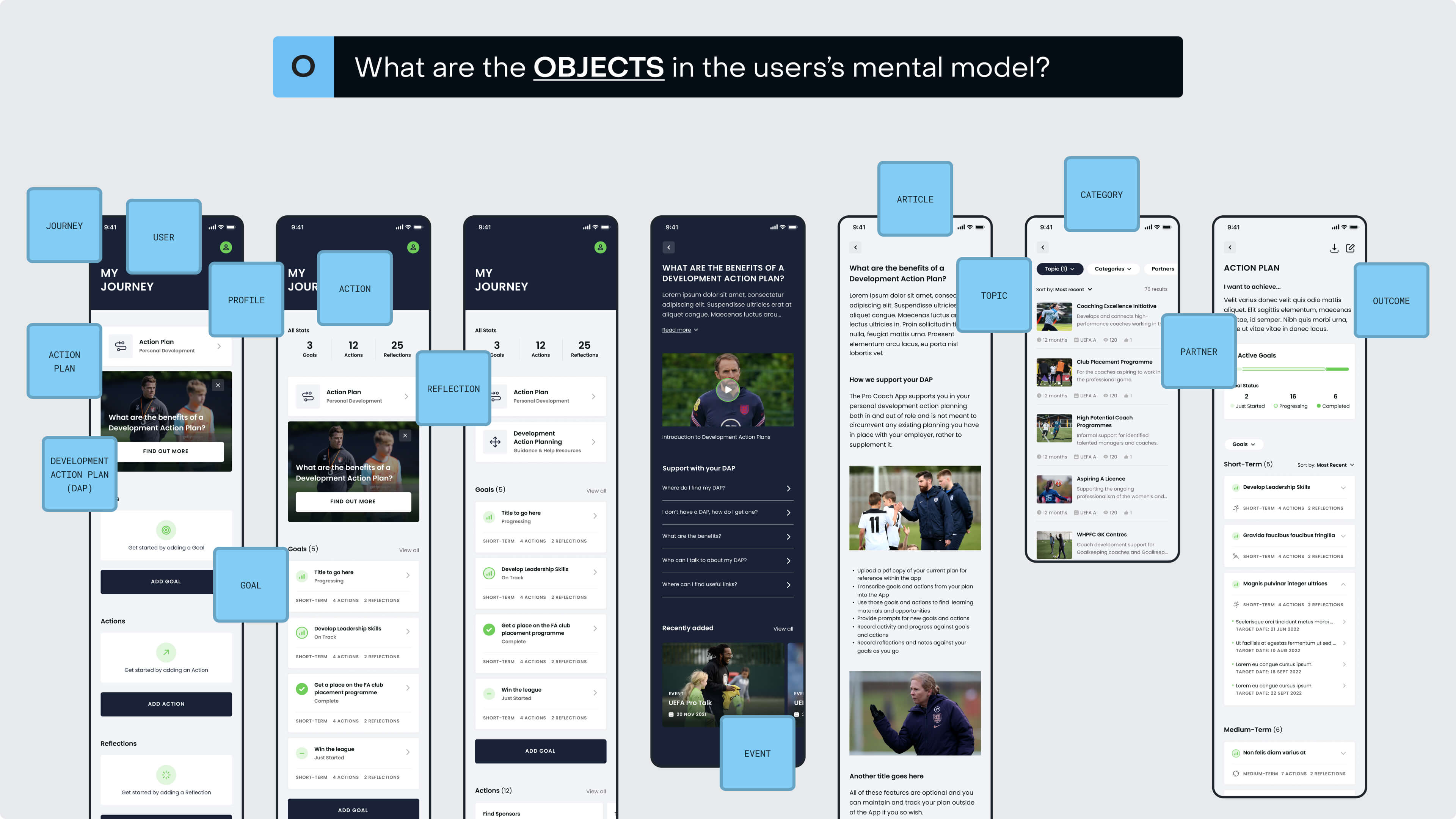 Navigation relied too heavily on a rigid main menu – Instead of a task-based UI, OOUX helped restructure content around coaches’ mental models of career progression.