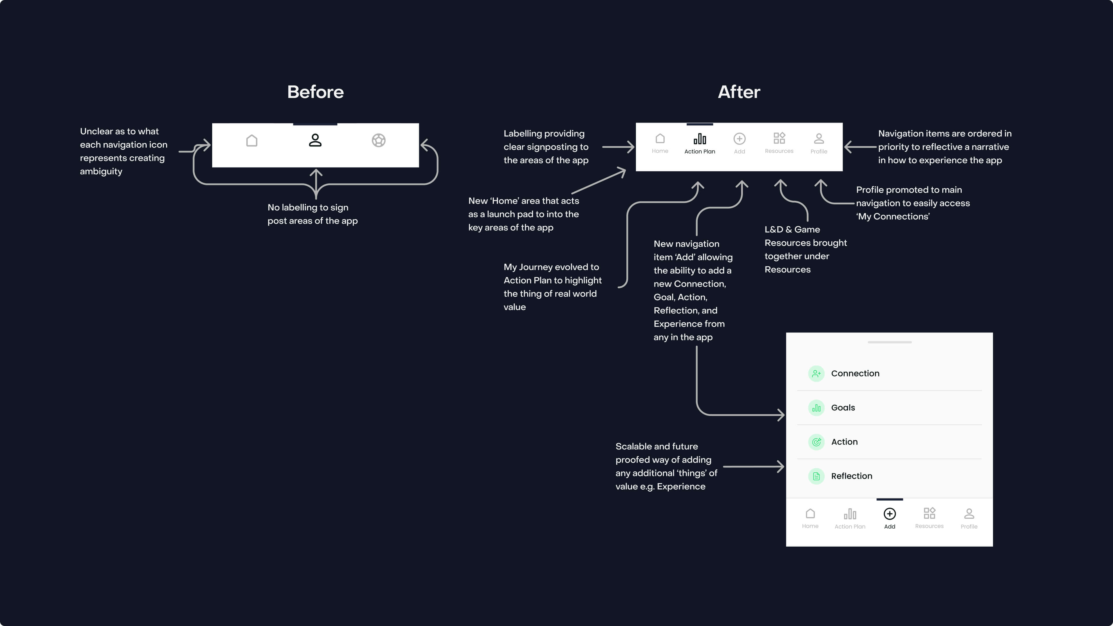 The app needed to seamlessly integrate various coaching tools, role profiles, and learning pathways while ensuring intuitive navigation for a diverse user base with varying levels of digital literacy.